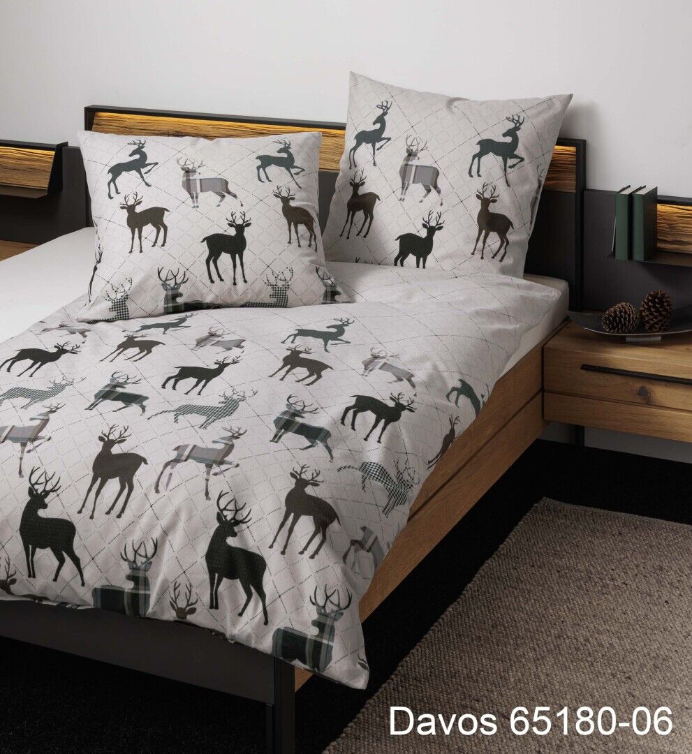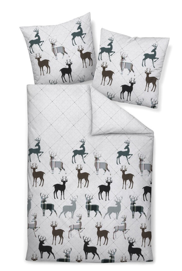 Die Janine Feinbiber Bettwäsche Davos 65180, aus der aktuellen Herbst-/ Winterkollektion von Janine, bringt winterliche Gemütlichkeit in Ihr Schlafzimmer. Auf einem beigen Untergrund tummeln sich Rentiere in Tannengrün, während sich beim genaueren Hinsehen ein dezentes, grafisches Muster offenbart. Kombinieren Sie die Bettwäsche von Janine mit jeglichen Einrichtungsstilen und genießen Sie die gemütliche Atmosphäre in Ihrem Schlafzimmer. Gefertigt ist die Bettwäsche aus hochwertigem Feinbiber. Der Stoff legt sich angenehm weich auf Ihre Haut und bettet Sie besonders in kalten Winternächten wohlig warm.