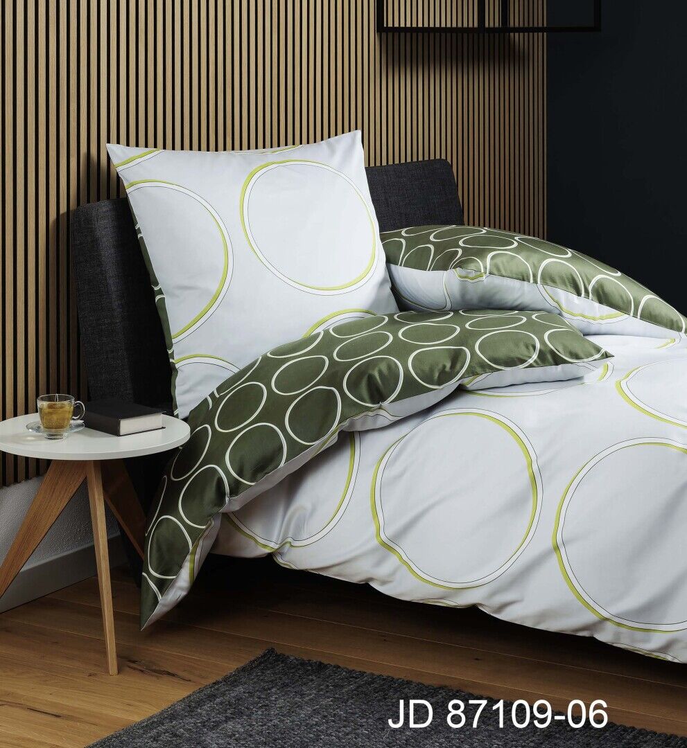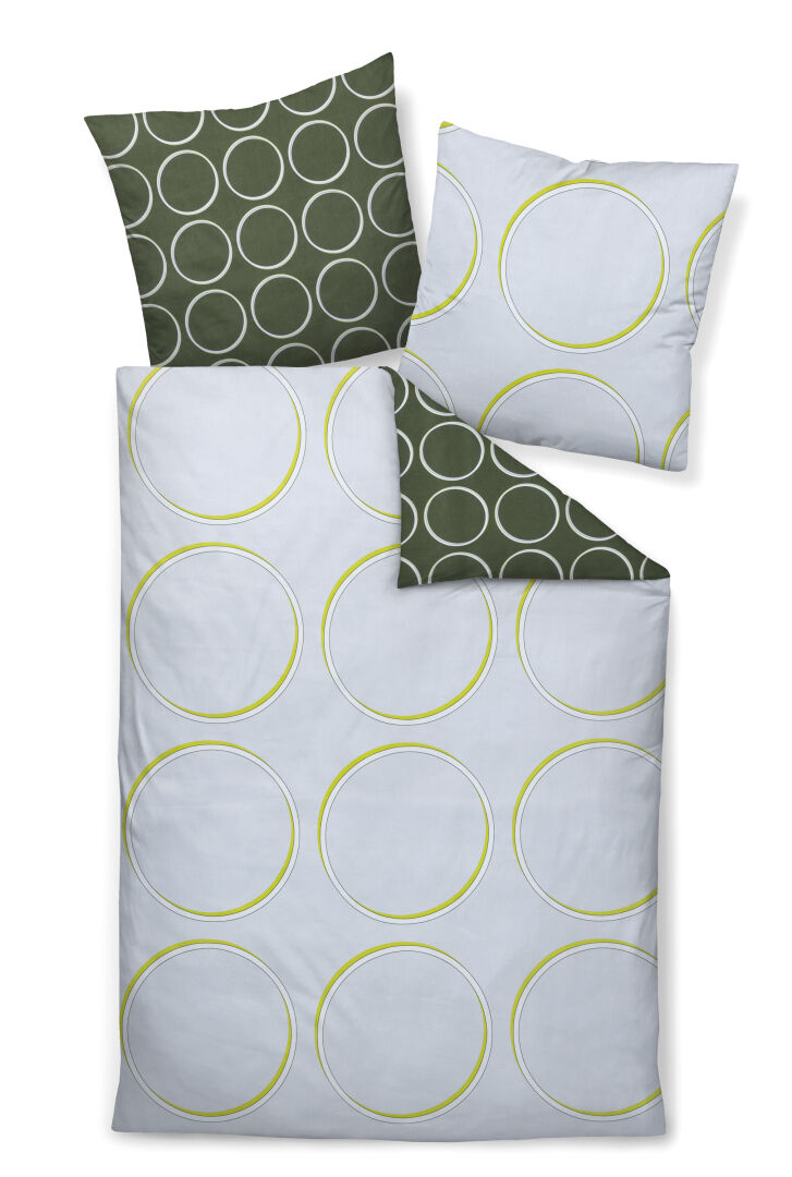 Ein echtes Statement ist die Janine Mako-Satin Bettwäsche J. D. 87109 aus der aktuellen Herbst-/ Winterkollektion von Janine. Als praktische Wendebettwäsche konfektioniert, überzeugt sie mit zwei spannenden Designs: Auf der einen Seite sorgt ein grüner Untergrund mit symmetrisch angeordneten, kleinen Kreisen für Klarheit. Die andere Seite überrascht mit einem silbernen Untergrund und großen Kreisformen. Besonders in modern eingerichteten Schlafzimmern kommt dieser Look hervorragend zur Geltung. Gefertigt ist die Bettwäsche von Janine aus hochwertigem Mako-Satin, welches sich wunderbar leicht auf Ihre Haut legt und höchsten Komfort garantiert.