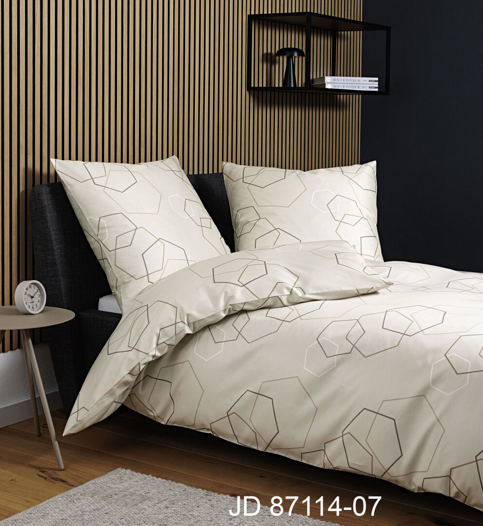 Mit der Janine Mako-Satin Bettwäsche J.D. 87114, aus der aktuellen Frühjahrs-/ Sommerkollektion von Janine, holen Sie sich einen modernen Hingucker in die heimischen vier Wände. Die Bettwäsche besticht durch dezent gestaltete Sechsecke, die sich überlappen und durch den naturfarbenen Untergrund harmonisch in Szene gesetzt werden. Das zurückhaltende Design der Bettwäsche von Janine verleiht Ihrem Schlafzimmer eine moderne und zeitlose Atmosphäre und die sanfte Farbgebung passt sich mühelos jedem Einrichtungsstil an. Gefertigt ist die Garnitur aus hochwertigem Mako-Satin, welches Sie mit seiner weichen Textur zum hinein Kuscheln einlädt und höchsten Komfort garantiert.
